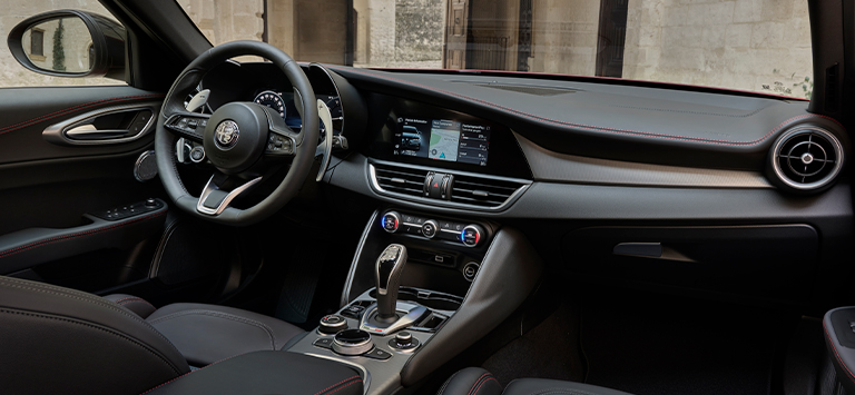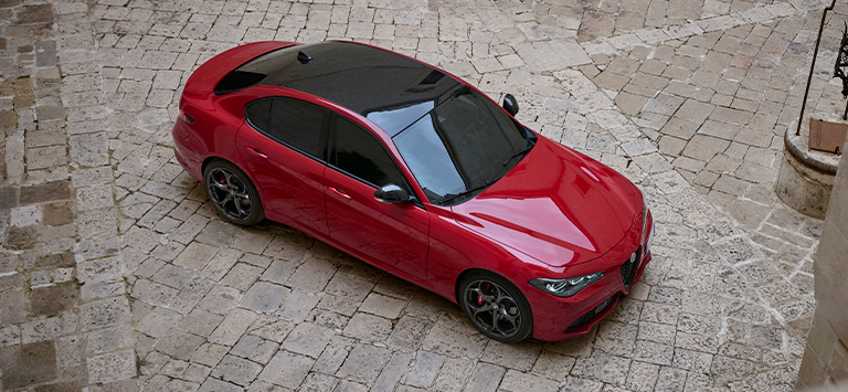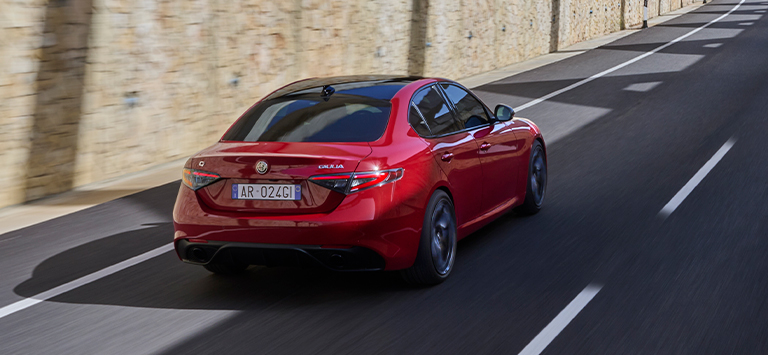 Consumo de combustível Alfa Romeo Giulia Tributo Italiano (l/100 km): 8,1 - 5,0; Emissão de CO₂ (g/km): 183 - 130. Valores determinados com base no ciclo ponderado WLTP, atualizados a partir de 26 de setembro de 2022 durante as atividades de teste de pré-aprovação e podem variar antes da homologação final. Os valores indicados são para fins comparativos.